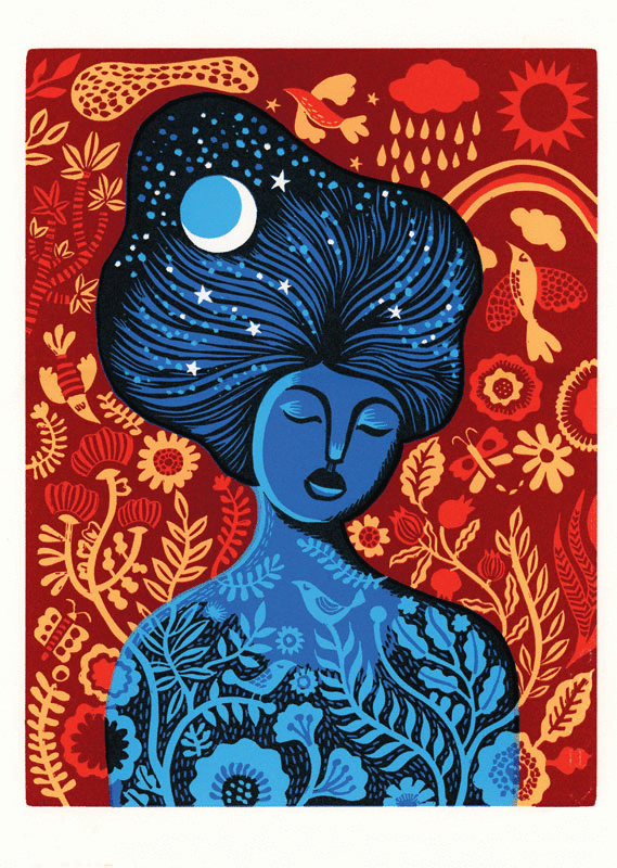 - Original Medium: Multi-block Reduction Linoleum Print